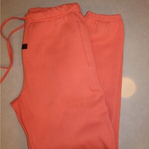 Soft coral sweatpants with elastic waist and adjustable drawstring. Comfortable fleece fabric for everyday play and movement. Practical side pockets for small essentials. Stylish coral color suits casual outfits.