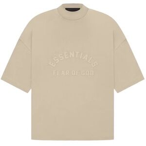Kids Essentials by Fear of God short sleeve tee in a neutral taupe tone with a raised arched logo across the chest. Features a minimalist mock neck and that signature oversized streetwear silhouette.