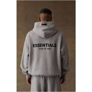 The Essentials Fear of God Light Oatmeal Hoodie features an oversized fit, long sleeves, an attached hood, a rubber brand logo on the hood, and an "ESSENTIALS" graphic on the front and back.