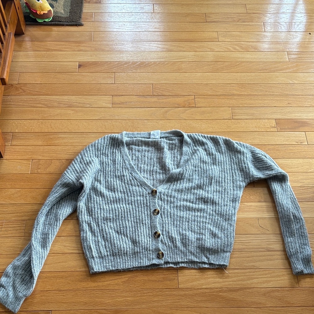 Chic gray cardigan with button-up front. Ribbed texture for added style. Ideal for layering.