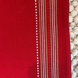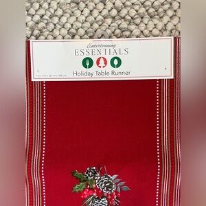 Festive red table runner with holiday design. Perfect for seasonal decor.
