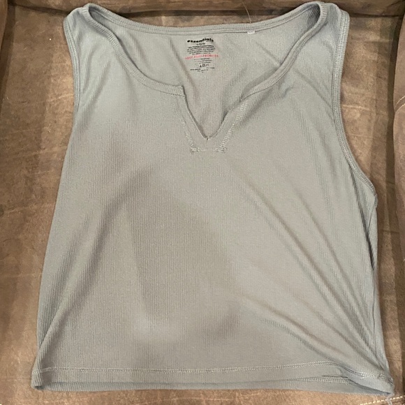 Light blue sleeveless tank with a subtle V-notch neckline. Ribbed knit fabric for lightweight comfort. Easy layering piece for casual outfits.