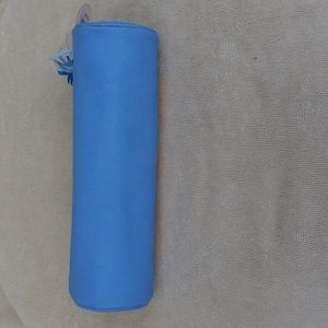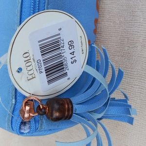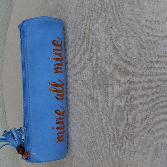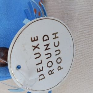 you can pack your essentials in this cute deluxe round pouch, tassel zip closure, fits in your purse or travel bag, lined with blue hearts, tiny discoloration by zipper, see details, see pics, NWT.