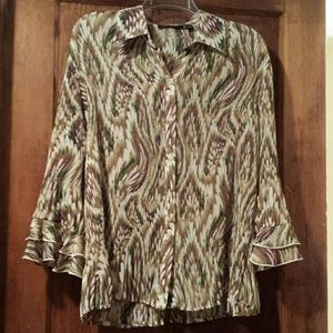 This is such a feminine and flattering blouse. Beautiful colors or dark purple, pine green, beige and white. Accordian texture and gorgeous sleeves.