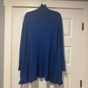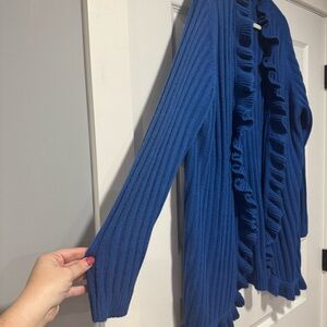 Chic royal blue cardigan with ruffled trim. Perfect for layering.