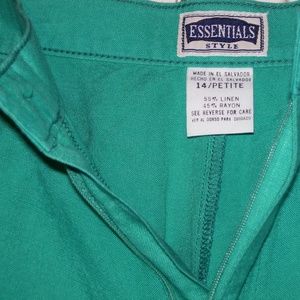 Essentials Style Green Shorts 55% Linen 45% Rayon, Size Petite, Pleated front, 2 pockets on the side. Gently used is in Excellent Condition.