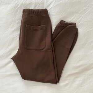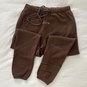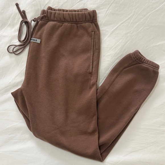 Comfortable brown Essentials sweatpants with elastic waistband and drawstring.