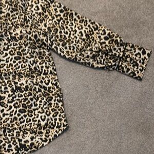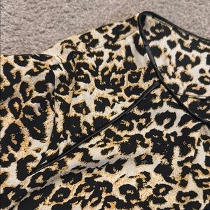 Chic leopard print top with bold design. Subtle black leather trim at neck, shoulders, and cuff make this blouse Ideal for stylish outings.
