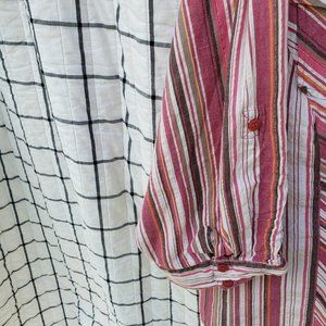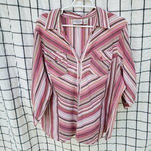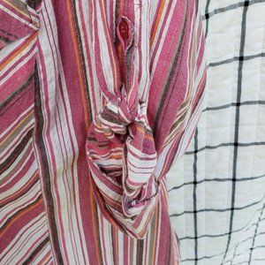 Essentials by Maggie button down shirt - cute chevron/vertical stripes in mauve / brown / thin gold stripe. Size 22/24 Has 3/4 sleeves which can roll up to make shorter. Gauzy like fabric. Wear by itself or with a tee or tank under it! Measures 27 inches wide and 26 inches in length.