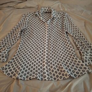 Essentials by Milano women's button-down shirt with black polka dots. Features a classic collar and long flutter sleeves.Ideal for versatile styling. Size small. pit to pit measures 20 inches. Length 26 inches.