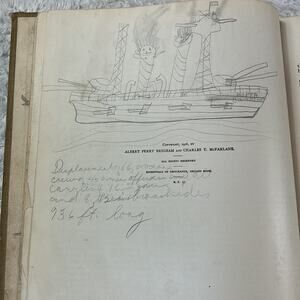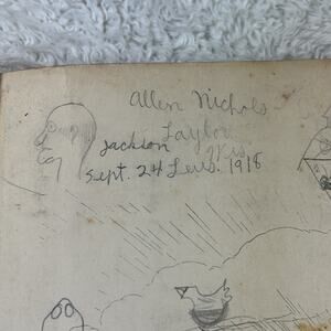 The inside cover has notes and drawings by some sassy youth named Allen Nichols of Taylor, WI on the 24th of Sept 1918 (a Tuesday according to him, which I verified.) He wrote: Dont Steal this book for here you see a hachet and my name allen nichols Taylor Wis Sept 24 T. 18