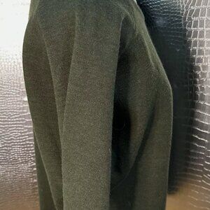 After launching a successful T-shirt collection that quickly took over their apartment, husband-and-wife designers Esfan Eghtessadi and Inge Onsea opened their first boutique in Antwerp, Belgium in 2000. Today, Essentiel Antwerp is a complete ready-to-wear line marked by playful prints, pop colors and spot-on detailing. This beautiful sweater is a great addition to any wardrobe. It's size Medium, in a pretty forest green. There are playful black fabric flowers gracing one side of the collar. Made of Merino Wool and Acrylic, in excellent preowned condition.
