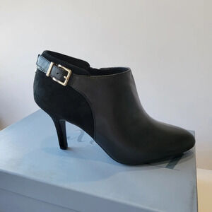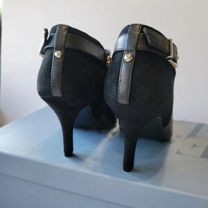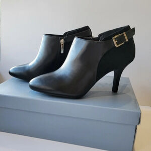 Elevate your wardrobe with these sophisticated Essex Lane Jasmine ankle booties. A perfect fusion of sleek faux leather and soft suede-like textures, these pointed-toe heels are designed to make a statement. The silver-tone buckle strap at the back adds a refined touch, while the inner zipper makes them easy to slip on and off.