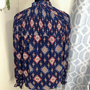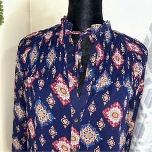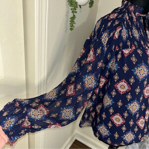 Elevate your wardrobe with this stunning long sleeve sheer blouse by Essue. This chic piece features a mock neck tie and a keyhole front for a touch of sophistication. The delicate ruffle cuffs add a feminine flair.
