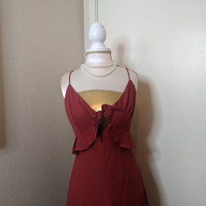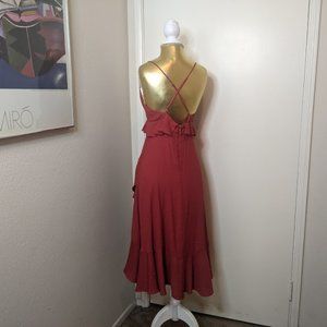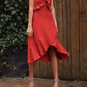 Red flounce midi dress with tie detail on front and crossing adjustable straps in the back. Slit on front with ruffle details. Dress fits true to size Model is wearing a size small.