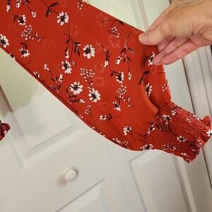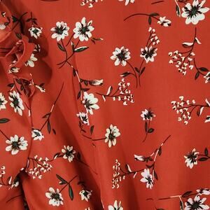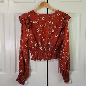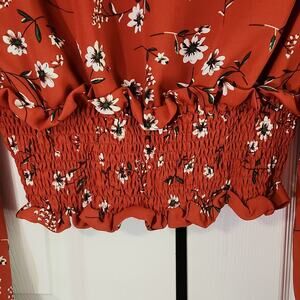 Essue Womens Burnt Orange Floral Blouse Size Med Deep V-Neck Cropped Smocked
