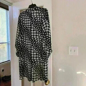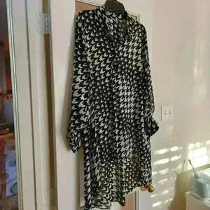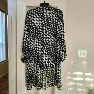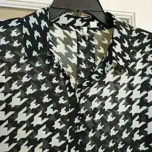 Est. 1946 women's sheer houndstooth half button up collared pullover top. Great for fall! This top is light and flowy, long in the back, and sheer all over. Would go great with a black cami underneath and a nice pair of jeans or slacks.