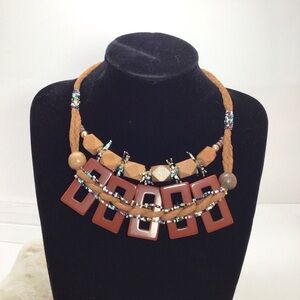 Est 1946 Potting Soil Brown Wood Beaded Cord Choker Statement Necklace.