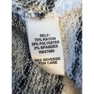 Stylish Established 1948 women’s blouse in a white and gray patterned design. Size Large. Made in China from a soft and breathable blend of 70% rayon, 28% polyester, and 2% spandex for comfort with a touch of stretch.