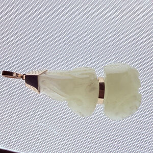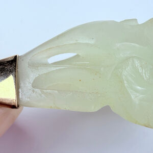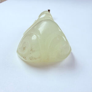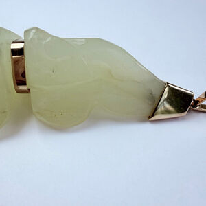 Acquired from an Estate of a Jade collector comes this very old 19th century Hotan (Hetian) in Xinjiang, China Chinese Carved jade Nephrite known commonly as “Mutton Fat”. The jade is translucent warm creamy white / Pale and slight green undertone. No cracks or fissures. The captivating jade carving is intricately carved into a fluid, organic abstract form with delicate curves and subtle detailing. The bottom section has a narrow neck minute passage which has been capped in 14K solid gold to enhance the pendant when worn. Thick top cap bezel and large bale all in solid 14K yellow gold. The carving is compact and solid, with a smooth finish that invites touch. This unique jade carving is a timeless addition to any collection, showcasing the beauty of natural stone artistry.