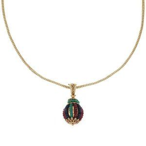 This is a beautiful pendant and chain, crafted from 14k yellow gold, the pendant features a gold ball covered with strands of beads, sapphire, emerald and ruby with a single row at the top in emerald and it comes with a filigree clip bail. The fine bead chain is 2mm thick and it secures with a lobster clasp.