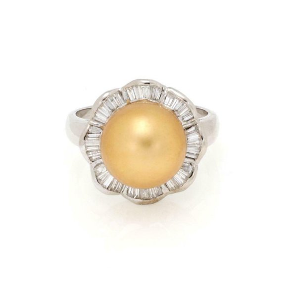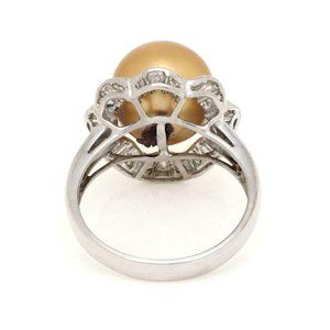 This 14k white gold features a scallop bezel frame set with baguette diamonds, all totaling 1.50 carats! The center of the scallop frame has a large 14mm golden South Sea pearl, the shank is an open gallery which flows to the shoulders and tapered band which has the metal content stamp.