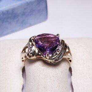 Estate 2ct Natural Checkerboard Trillion Amethyst/Diam 10Kt YG scroll Ring#22797