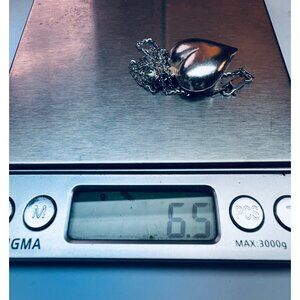 The necklace weighs 6.5 grams total, including both chain and pendant. Based on measurements shown in photos, the pendant is approximately 1 inch (25 mm) in height (including bail) and has a full, dimensional shape. The bail is stamped “925”, confirming genuine sterling silver.