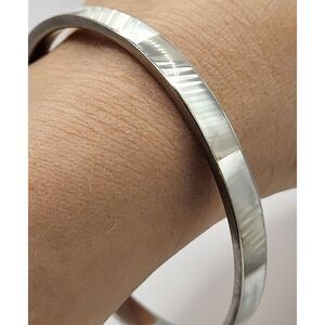 Estate Abalone Mother of Pearl Inlay Bangle Bracelet 7.6in | Materials: abalone shell, motehr og pearl, silver metal alloy | Length: 7.6in circumference | Clasp: slide on | Signed? no | Excellent vintage condition