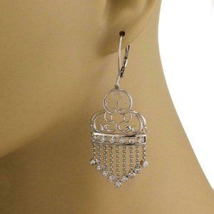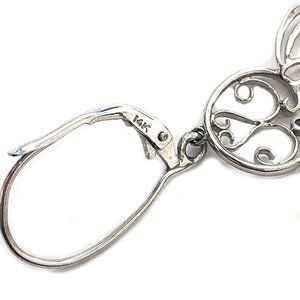 This is a beautiful pair of Estate earrings, they are crafted from 14k white gold with a polished finish featuring hook backs with lever clasp. Below is an open fancy frame with scroll design. The earrings are hallmark 585 14k.