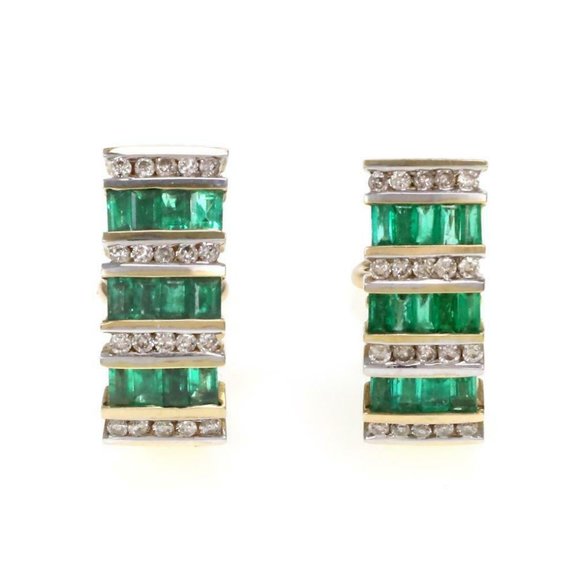 A lovely pair of Estate earrings are crafted from 14k yellow gold featuring a long wide curved frame set with round cut diamond and rectangular cut emerald gemstone. The stones are set in an alternating pattern set between each row. Comes with post omega backs and it has the 14k metal content stamp.