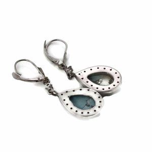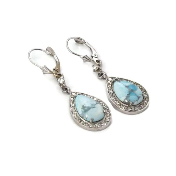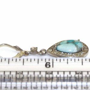 This is a beautiful pair of white gold, diamonds and turquoise ladies drop dangle earrings. The pair is well crafted in 14k white gold with a smooth polished finish each adorned with a beautiful pear shape cabochon turquoise accented with round cut sparkling diamonds. Comes with hook top lever backs.