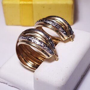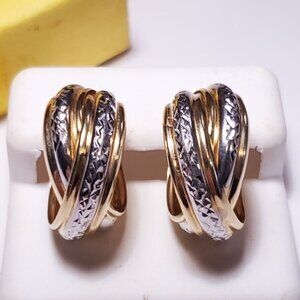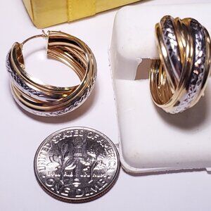 Estate Double crossover 14Kt2Tone diamond etched 3/4" diameter Hoop Earring22998