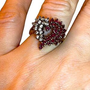 Estate Gold Vermeil 925 Sterling Silver Ruby & CZ Cluster Heart Cocktail Ring