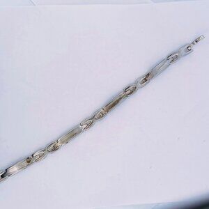 This stunning Estate Hector Aguilar Steklini Mexico Sterling Silver 925 Bracelet showcases timeless craftsmanship and bold geometric design. Measuring approximately 7.5 inches in length and weighing 24.9 grams, this substantial bracelet features sleek rectangular links joined by stylized oval connectors, reflecting the hallmark modernist aesthetic of Mexican silversmith artistry. Each link is solid and beautifully contoured, offering both comfort and durability.
