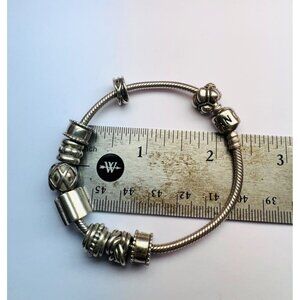 Beautiful Estate Pandora Sterling Silver 925 Charm Bracelet featuring an elegant snake chain design adorned with multiple authentic Pandora charms. The bracelet measures approximately 7.5 inches in length and weighs 41.6 grams. Hallmarked “925 ALE”, confirming genuine sterling silver authenticity.