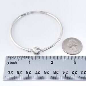 Estate Pandora sterling silver 925 charm bangle bracelet featuring the classic logo barrel clasp. Sized 7.25”, this sleek bracelet is perfect for adding charms or wearing alone as a minimalist silver piece.
