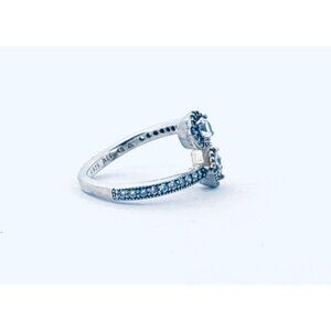 This beautiful estate Pandora ring is crafted from genuine sterling silver 925 and features a unique crossover bypass design with two sparkling stones. One stone is set in a round halo setting, while the other is showcased in a square halo setting, giving the ring a versatile and elegant look. The band is accented with shimmering clear stones along the shoulders, adding extra brilliance.
