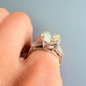 The ultimate representation to the commitment to marry, she will definitely say "Yes" to this ring. In full Platinum comes this exquisite colorless 3.85 carat White Spinel show stopping center stone. The center is guarded by two, one on each side baguette cut white Spinel, each approximately .35 carats. Total carat weight is 4.55. Immaculate classic design with an amazing step up high setting, open gallery. This is a vintage estate gem!