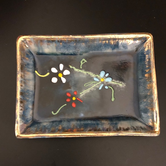 This handcrafted pottery dish or tray features a hand painted floral design with vibrant colors and gilded edge. Perfect for small trinkets and treasure. Note tiny flaw on one edge. (A touch of gold paint should fix it.) Likely vintage.