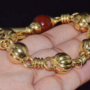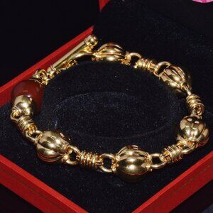 Vintage Etruscan European Primavera Preziosi designer 18K solid gold carnelian bead bracelet. This wonderful European bracelet has a magnificent fluted balls and cherry red carnelian bead accent design. This bracelet has a stunning smooth / high shine beads and moving rings alternating design. Extremely durable solid gold bracelet. Can be worn as is or as a charm bracelet. There is plenty of space to add charms if desired. This bracelet closes with an elaborate toggle clasp. The clasp is solid and sturdy, so its very secure and safe to wear.