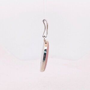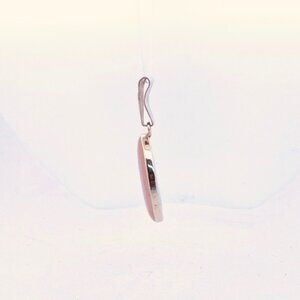Beautiful estate jewelry pendant featuring a soft pink oval rose quartz cabochon set in 925 sterling silver. The stone displays natural translucency with gentle internal veining typical of genuine rose quartz. The pendant is finished with a modern triangular sterling silver bail, stamped 925 STER, confirming metal purity.