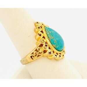Add timeless elegance to your collection with this estate Ross Simon’s designer ring, featuring a genuine Sleeping Beauty turquoise cabochon in a stunning teardrop shape. The vibrant turquoise is bezel set and surrounded by intricate gold-tone scrollwork on a filigree design band. Crafted in 14k yellow gold over solid sterling silver (.925), this statement ring is a size 8.75 and weighs approximately [insert weight here] grams. Beautiful from every angle, this piece showcases high craftsmanship and vintage charm. A standout gift or collectible piece.