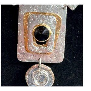 Elevate your style with this handcrafted necklace, featuring a striking blend of silver and gold geometric shapes. Its bold design makes a statement, while the quality craftsmanship ensures lasting elegance. A must-have for those who appreciate unique and artistic jewelry pieces.