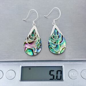 Estate sterling silver 925 abalone teardrop earrings showcasing natural iridescent shell with luminous blue, green, and violet tones. A classic drop silhouette that adds color and movement, perfect for everyday wear, coastal style, or boho-inspired looks.