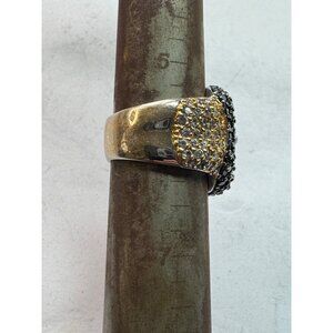 This estate statement ring features a bold buckle design, finely crafted in solid sterling silver 925. The ring is adorned with sparkling black and white cubic zirconia stones, creating a striking two-tone effect. The gold overlay highlights the buckle strap while the black CZs accentuate the buckle outline, giving it a luxurious contrast.