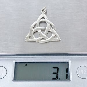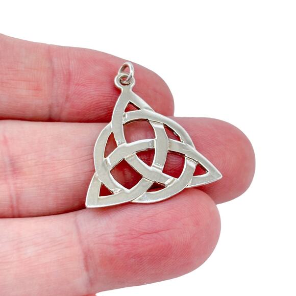 Estate sterling silver 925 Celtic knot triangle pendant, featuring an interwoven trinity design symbolizing unity, protection, and eternity. A meaningful piece for lovers of Celtic symbolism, pagan themes, or classic geometric silver pendants.