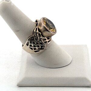• Estate Sterling Silver 925 Celtic Wide Band Ring w/ Yellow Gemstone, Size 8