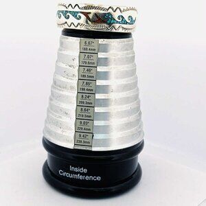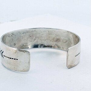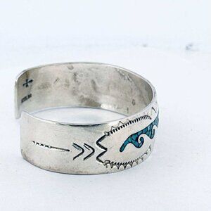 Beautiful estate sterling silver 925 cuff bracelet featuring intricate hand-stamped Native American style designs with turquoise and coral inlay in a wave pattern. The inside is stamped STERLING with a hallmark. This solid piece weighs 25.5 grams and fits a 6-inch wrist. A stunning Southwestern collectible, perfect for everyday wear or for any jewelry collection.