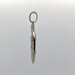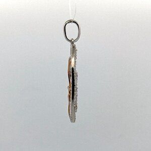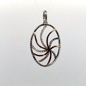 Add a touch of vintage elegance to your jewelry collection with this stunning Estate Sterling Silver 925 pendant. This oval-shaped pendant features an openwork swirling design with diamond-cut accents and a dual-tone finish—highlighting gold-toned curved elements for added contrast and depth. The front of the pendant is bordered and detailed with sparkling clear stones, arranged in a precise pavé setting for maximum brilliance. Marked “925” on the back, the pendant weighs 4.0 grams and measures approximately 1.75 inches in length (including bail), as shown next to a U.S. quarter for scale. Chain not included.